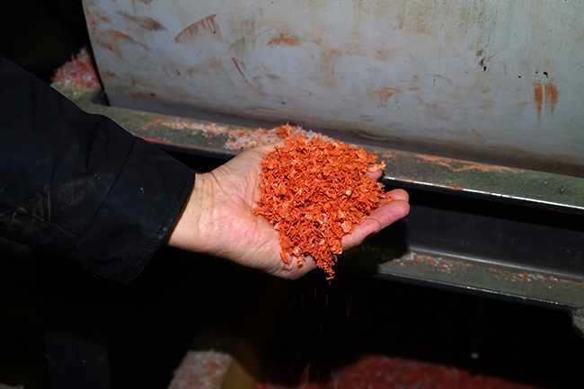 «Сначала полиэтилен поступает в дробильную машину, ножи его перемалывают, и получаются полиэтиленовые хлопья. Затем эти хлопья смешиваются с песком, туда добавляется краситель. После этого песочно-полиэтиленовая смесь отправляется в плавильный агрегат», - рассказывает Владислав Алексеевич.