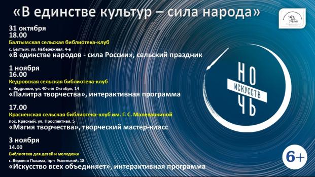 31 октября и 1 ноября библиотеки городского округа Верхняя Пышма примут участие во всероссийской акции «Ночь искусств–2025». Мероприятия пройдут под девизом «В единстве культур — сила народа» и будут посвящены Дню народного единства.