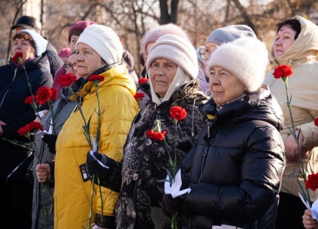 Участники театральной студии «ДеТствие» представили литературную композицию, включавшую стихотворение «Я белого журавлика сложу...». Завершилась церемония минутой молчания и возложением белых бумажных журавлей к мемориалу.