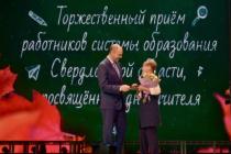На торжественном собрании губернатор Свердловской области поблагодарил педагогов за бесценные уроки, жизненную мудрость, терпение и настойчивость в воспитании юных уральцев, а также вручил почётное звание «Заслуженный учитель Свердловской области» шести педагогам из Екатеринбурга, Берёзовского, Тавды, Новой Ляли и Алапаевска. Всего такой награды удостоены более 40 человек.