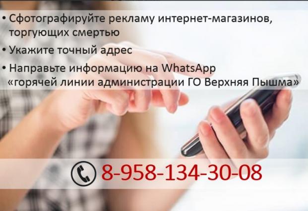 В Верхней Пышме увеличилось количество граждан, умерших от отравления наркотиками. Смертельная опасность угрожает нашим детям, будущему поколению верхнепышминцев. В борьбе с наркотиками мы можем победить только все вместе. Вандалы портят фасады наших домов, рисуя стеновую рекламу интернет-магазинов, торгующих смертью. Каждый из нас в силах сфотографировать надпись на доме и указать точный адрес.