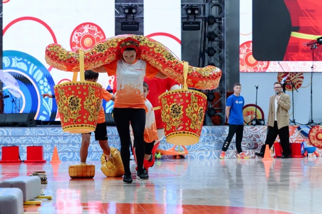 Под аплодисменты зрителей шесть команд проходили эстафеты. В этом году шоу стало путешествием в мир русских народных сказок. Папы перевоплощались в богатырей, мамы в девиц-красавиц с длинными «косами». И за каждым колоритным элементом – очередное испытание. Проскакать на надувном медведе по «кочкам», сделать причёску из непослушных длинных «прядей». Пробежать быстрее всех в костюме-матрёшке и точно забросить пирожки в чудо-печку.