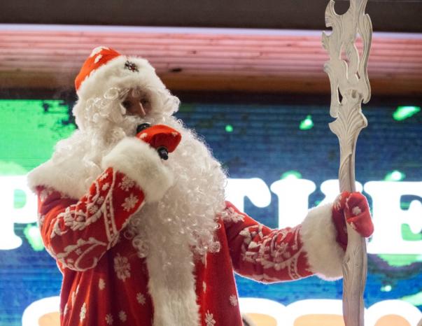 И тут вдруг все стало понятно. Такой холод нужен был для Деда Мороза. Но просто так он выходить к гостям отказывался, нужно было его позвать. Ведущая и все присутствующие громко стали кричать: «Дедушка Мороз! Выходи!» И он услышал. Он пришел. В нарядном алом кафтане, в валенках, с ледяным посохом и с густой белой бородой.