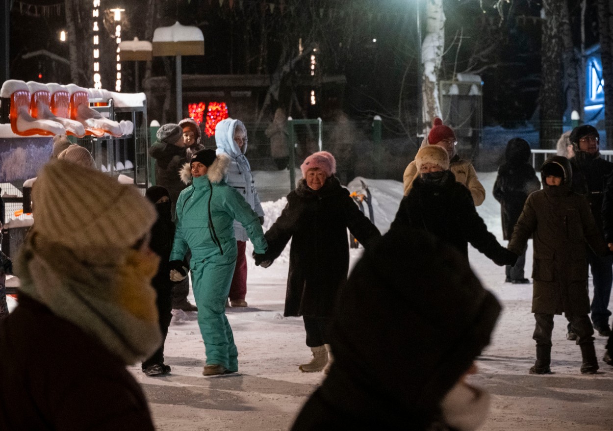 На столбике термометра в этот вечер виднелась неутешительная цифра: -26℃. Погода решила заявить о себе и ударила под конец декабря морозами. Но люди, которые пришли на открытие Елки, не унывали. Ни одного грустного лица замечено не было. Все танцевали, смеялись, шутили, дети бегали друг за другом и играли в снежки. Но больше всего внимания привлекла собака породы сиба-ину. Она вставала на задние лапки перед посетителями парка, гонялась за снежными шариками.