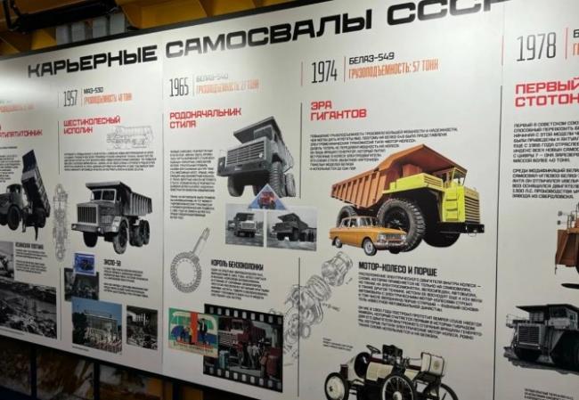 «Выставка состоит из двух зон. Первая знакомит с историей карьерных самосвалов — от моделей времен СССР до современных машин, и рассказывает: о грузовике ЯС‑1 Ярославского завода 1930‑х годов (грузоподъемность около 4 тонн), первых моделях завода БелАЗ — БелАЗ‑530 и БелАЗ‑540 1950–1960‑х годов и БелАЗ‑75710 — самосвале, внутри которого расположена выставка», — поделились в комплексе.
