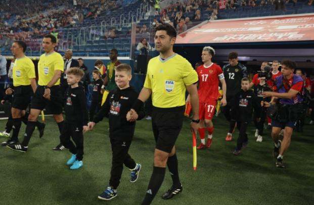 Максим выводил судейскую бригаду, поэтому в числе первых оказался на поле.Такая возможность предоставляется единицам юных футболистов, ведь многие даже не мечтают оказаться с национальной сборной на одном поле, не говоря уже о том чтобы стоять с ними плечом к плечу во время исполнения гимна России.